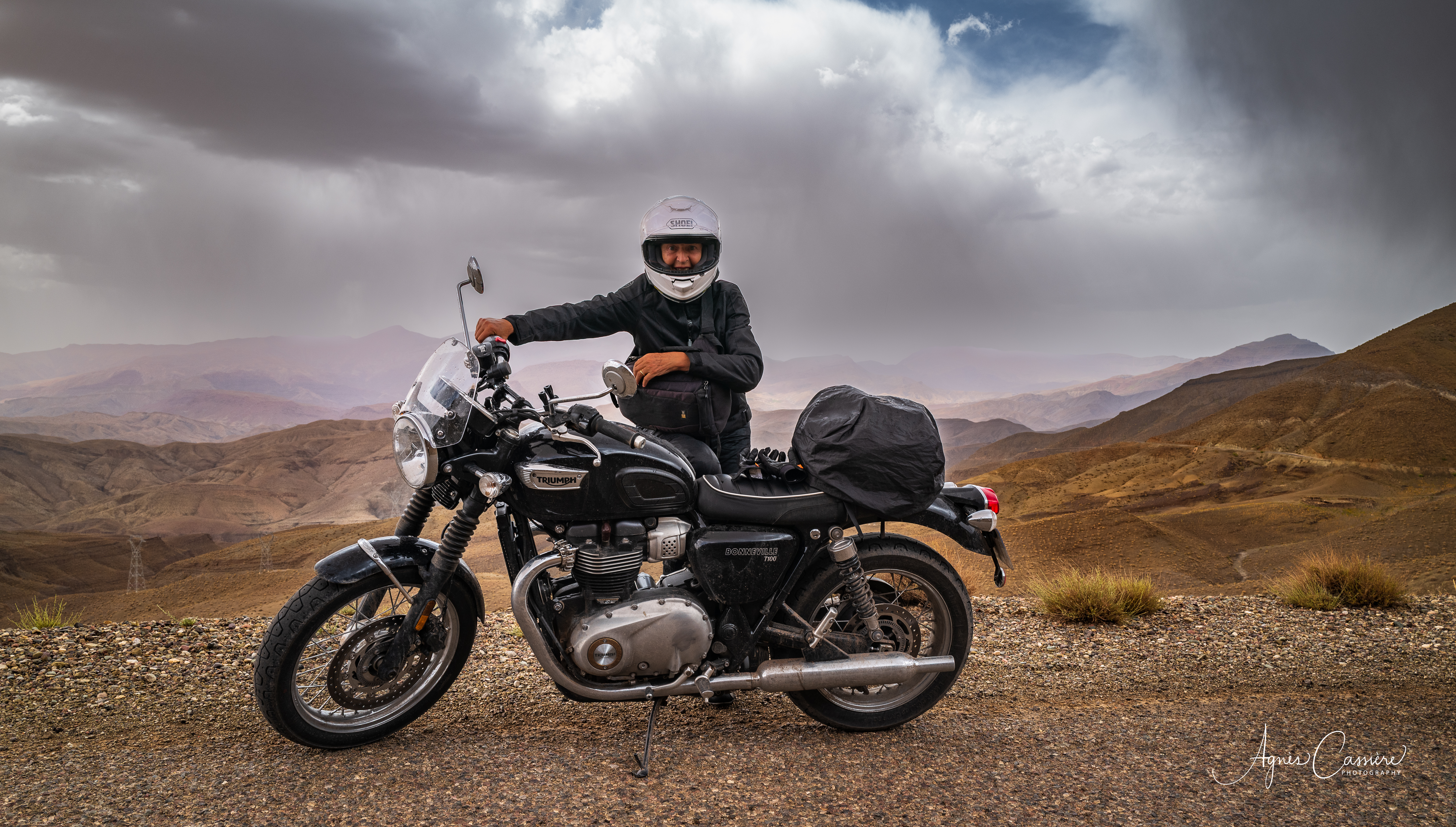 Au guidon de sa moto, par des pistes et des routes sinueuses, Agnès Cassière parcourt des territoires saisissants : montagnes minérales et sauvages du Haut Atlas, plateaux de l’Anti-Atlas, oasis et gorges verdoyantes, cèdres majestueux, palmiers dattiers et arganiers, déserts arides ou sablonneux du sud, sans oublier les côtes sauvages de l’océan Atlantique.