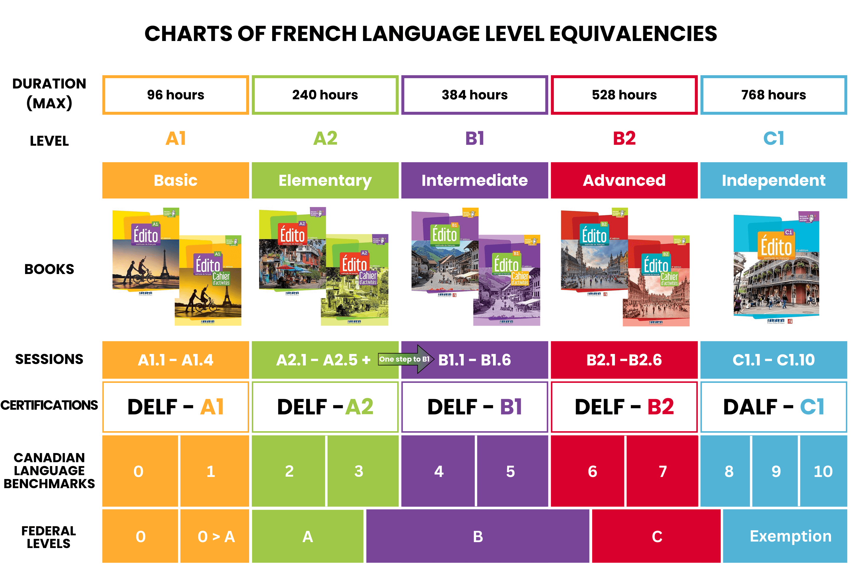 Our level groups and progression are defined according to the Common European Framework of Reference for Languages (CEFR). Below, you’ll find a chart of the different levels, corresponding textbooks, exams, and their Canadian level equivalents.